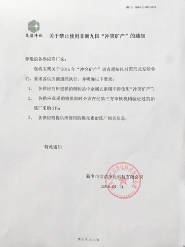 關(guān)于禁止使用非洲九國沖突礦產(chǎn)的通知 我公司提出關(guān)于禁止使用非洲九國沖突礦產(chǎn)的通知,請各供應(yīng)商嚴(yán)格按照要求實(shí)施!